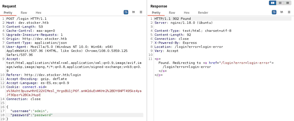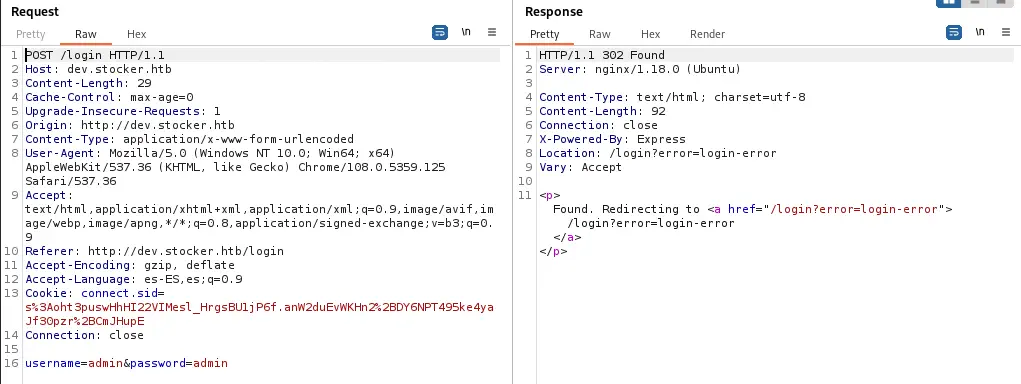 Encontramos un subdominio, dev.stocker.htb, que redirige a una página de inicio de sesión, por lo que lo añadimos al archivo /etc/hosts.