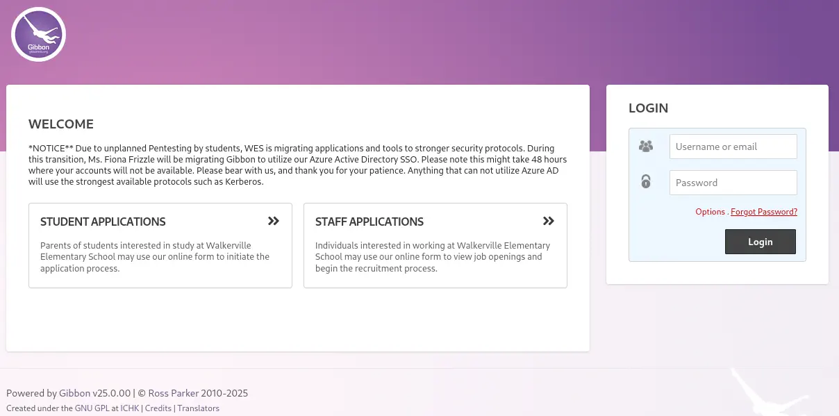 En el servicio HTTP encontramos la página del “Colegio Primario Walkerville”. Podemos hacer clic en el botón Staff Login y se mostrará un cuadro de inicio de sesión para nosotros. Se redirige a la aplicación web Gibbon v25.0.00 en la carpeta Gibbon-LMS. Gibbon es un sistema de gestión del aprendizaje.️