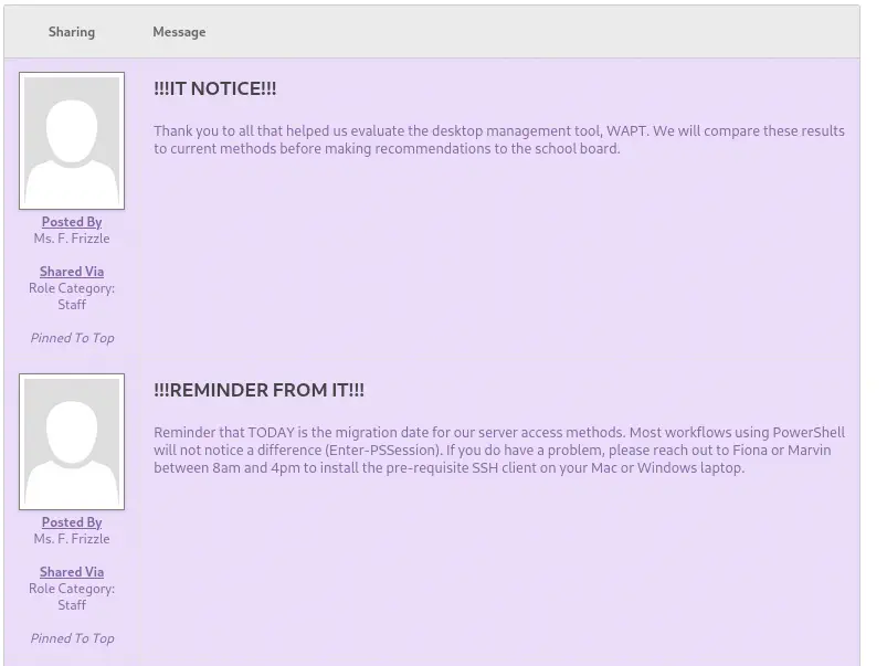 (00008, 'System', 'indexText', 'Index Page Text', 'Text displayed in system\'s welcome page.', '*NOTICE** Due to unplanned Pentesting by students, WES is migrating applications and tools to stronger security protocols. During this transition, Ms. Fiona Frizzle will be migrating Gibbon to utilize our Azure Active Directory SSO. Please note this might take 48 hours where your accounts will not be available. Please bear with us, and thank you for your patience. Anything that can not utilize Azure AD will use the strongest available protocols such as Kerberos.'),