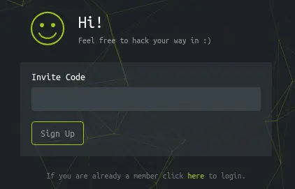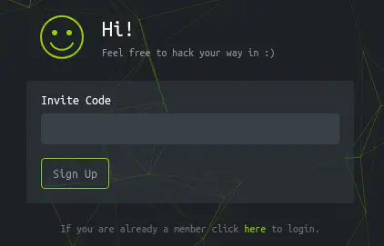 Tenemos la opción de iniciar sesión pero no tenemos credenciales. Enumerando los puntos de acceso, encontramos el punto de acceso /register, en el cual podemos registrar una cuenta. Necesitamos un código de invitación. Leyendo la página principal encontramos que para registrar necesitamos resolver un desafío de nivel básico presentado en el punto de acceso /invite.