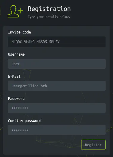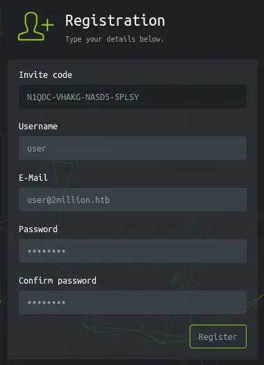 Obtenemos el código N1QDC-VHAKG-NASD5-5PLSY. Es aceptado y nos redirigimos a la página /register.