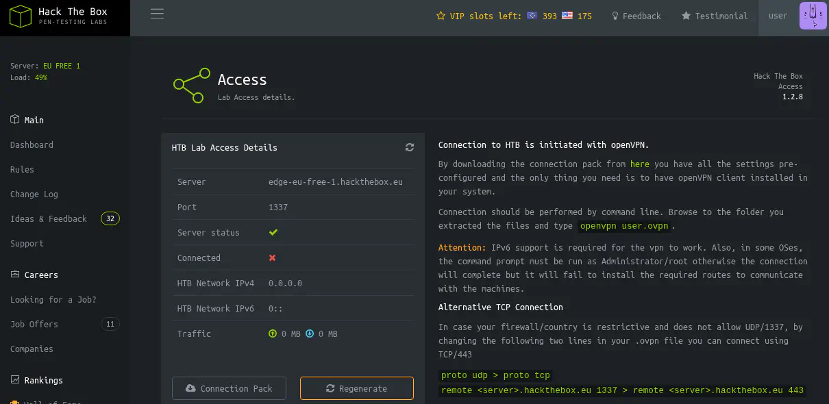 Encontramos que podemos descargar el paquete de acceso VPN (archivo .ovpn) desde la sección Labs > Access.