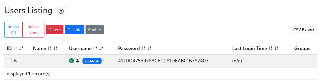 Podemos enumerar al usuario creado haciendo clic en el botón Go to users list. Encontramos uno, svcMosh, con la contraseña 412DD4759978ACFCC81DEAB01B382403.️