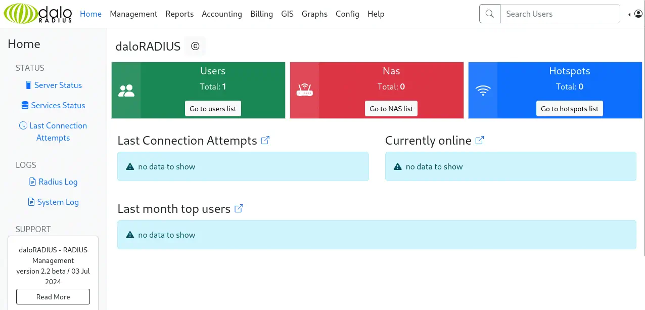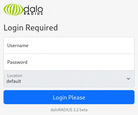 Las credenciales de inicio por defecto para esta aplicación son el usuario administrador y la contraseña radius. Accedemos al panel de control.️
