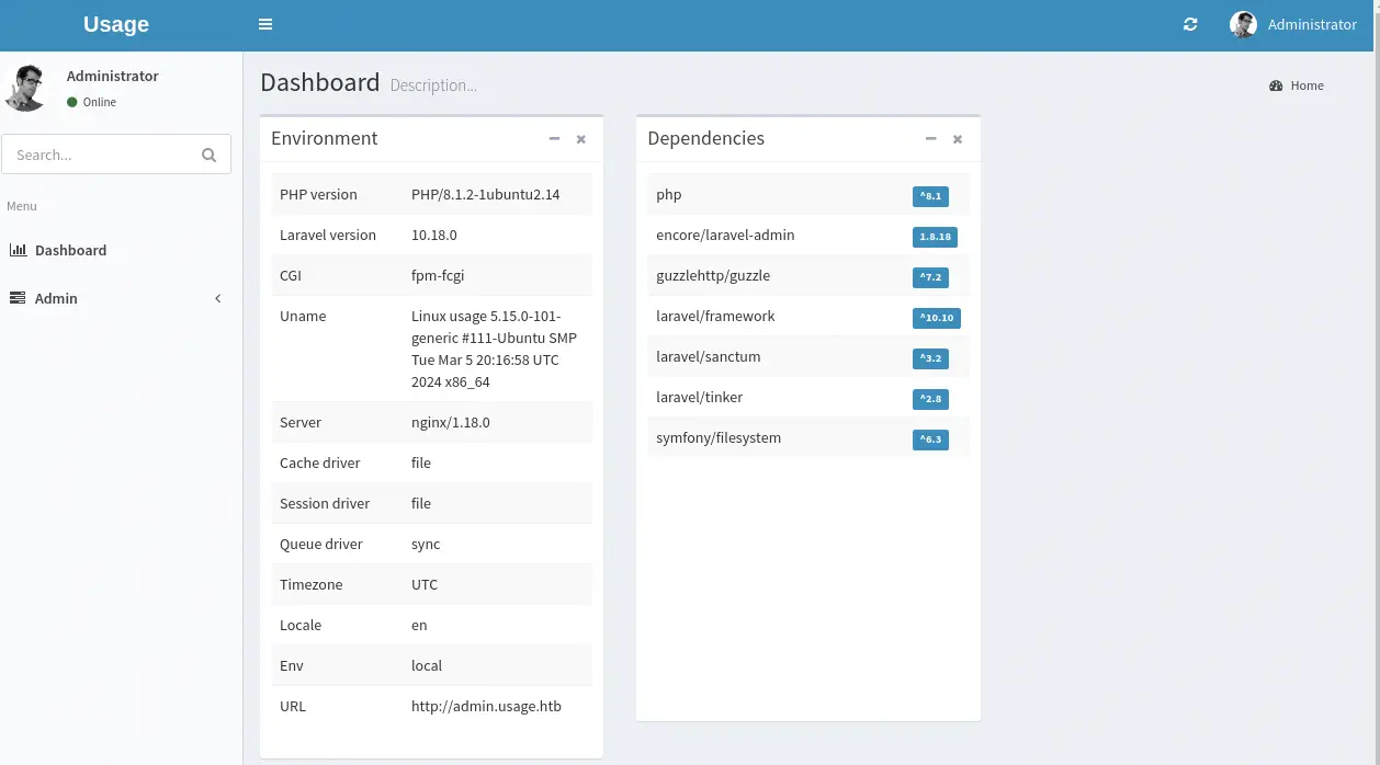 Podemos iniciar sesión, restablecer la contraseña, registrarse y acceder al panel de administración admin.usage.htb. Podemos añadir el subdominio a la lista de hosts.