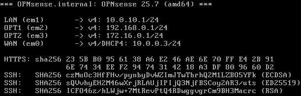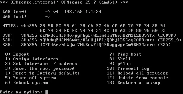 Tras la configuración de las interfaces de red iniciaremos la máquina e instalaremos OPNsense siguiendo las instrucciones del asistente con las credenciales installer:opnsensehasta que el sistema se reinicie y podamos acceder al menú inicial de opciones con las credenciales predeterminadasroot:opnsense.