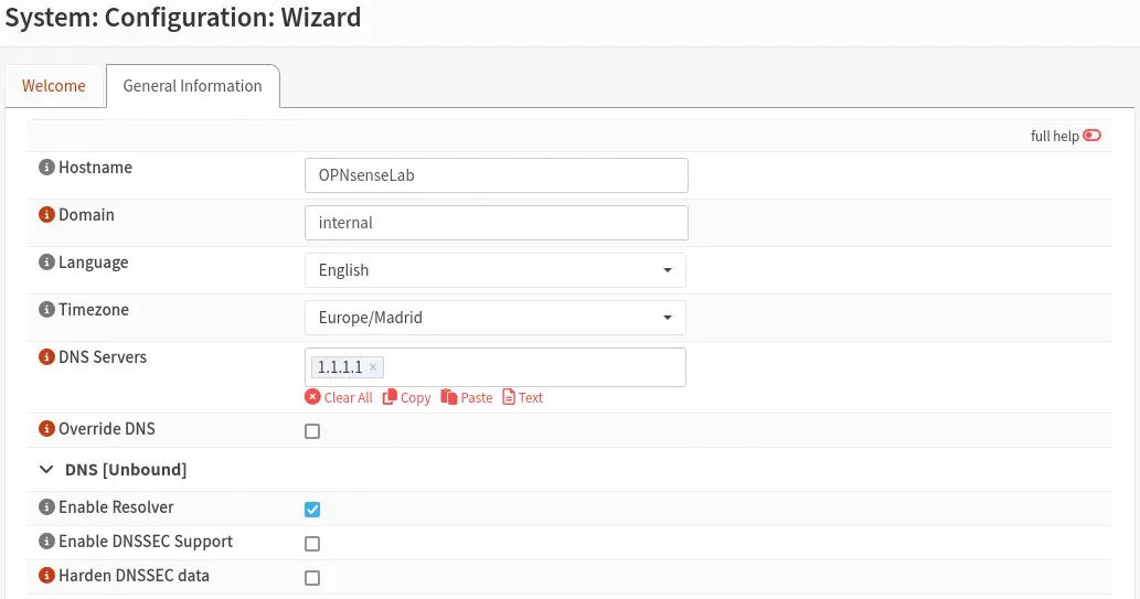 Accedemos a la interfaz web desde la puerta de enlace y realizamos la configuración inicial con los ajustes como el nombre del sistema, la zona horaria o los DNS.
