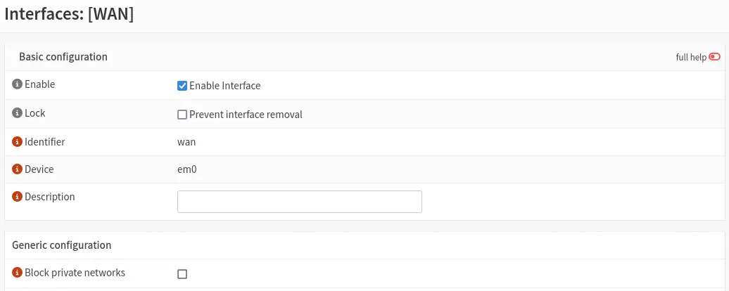 Al utilizar en este caso la red WAN rangos de direcciones IP privadas es necesario desactivar desde el menú Interfaces > [WAN] la opción Block private networks para que la conectividad sea correcta.