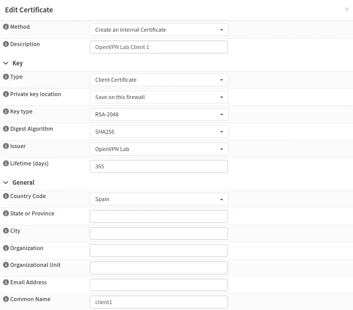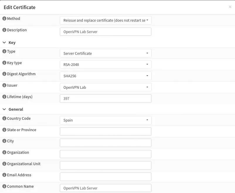 También necesitamos generar el certificado del servidor VPN desde System > Trust > Certificates. Es necesario indicar un que es un certificado de servidor, su nombre común y que el emisor del certificado sea la autoridad de certificación creada anteriormente.