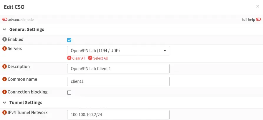 Nos movemos a configurar la configuración específica del primer cliente VPN desde el menú VPN > OpenVPN > Client Specific Overrides. Configuramos el servidor VPN, la descripción de la configuración específica del cliente, el nombre común del usuario, y la dirección de red que tendrá el cliente en la subred VPN.