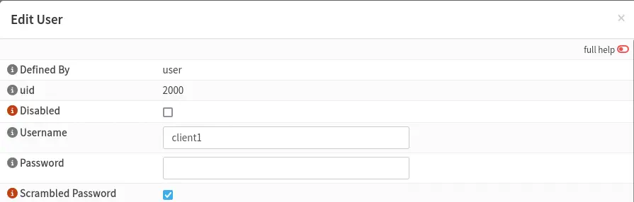 Luego configuramos un usuario nuevo en el sistema con el nombre que generamos anteriormente, desde el menú System > Access > Users. Configuramos el nombre de usuario y la opción Scrambled Password para que el usuario no se pueda utilizar para otros usos.