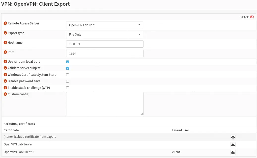 Ahora ya disponemos de la opción para descargar el archivo .ovpn con el cuál podremos conectarnos al servidor OpenVPN desde la sección VPN > OpenVPN > Client Export. Hay que configurar el servidor VPN a utilizar, el tipo de exportación a solo un archivo, como nombre de host especificamos la dirección IP de la interfaz WAN, y el puerto. Al final de la página aparecerán las descargas.