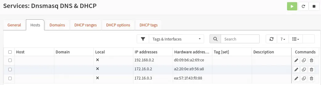 Para cada grupo de máquinas replicadas, es necesario establecer tres asignaciones estáticas de direcciones IP en el servidor DHCP, configurando las redes correspondientes. Dos de estas asignaciones estarán destinadas a la máquina Linux VM1 (en las redes DMZ e interna), mientras que las otras dos se asignarán a la máquina Linux VM2 (en la red interna). Se hará desde la sección Services > Dnsmasq DNS & DHCP > Hosts. Por cada asignación indicaremos dirección MAC y dirección IP. Al no haber configurado todavía las máquinas introduciremos direcciones MAC aleatorias y las direcciones IP.