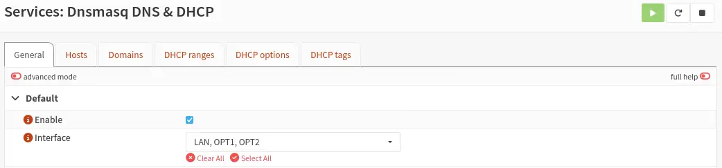 A continuación habilitaremos el servidor DHCP en las interfaces de la DMZ (OPT1) y de la red interna (OPT2) por si no estuviera activado en la sección General.