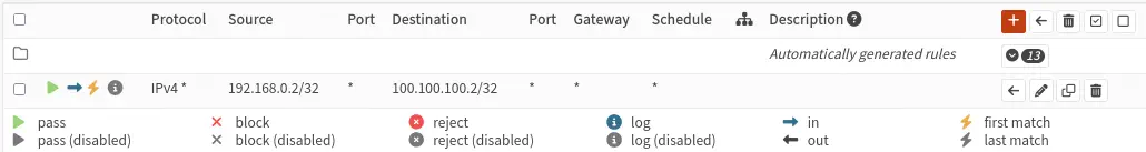 La máquina VM1 solo podrá recibir conexiones procedentes de la red LAN, de la máquina VM1 y del cliente VPN. Para ello será necesario configurar unas reglas de cortafuegos desde OPNsense y otras desde las propias máquinas. Configuramos las reglas desde el menú Firewall > Rules.