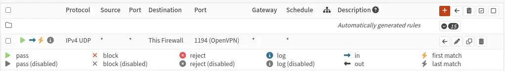 Abrimos el puerto de OpenVPN para que sea accesible desde la red WAN. Especificamos como destino el servidor VPN, como protocolo VPN y como puerto de destino OpenVPN.