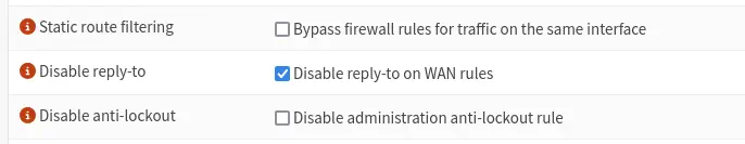 Para que se pueda acceder a los puertos abiertos del cortafuegos tenemos que activar la opción Disable reply-to accesible desde Firewall > Settings > Advanced.