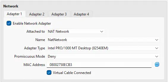 - La primera de las interfaces será la de la red WAN, es decir, la red desde la cual se dispondrá de acceso a Internet y desde la cual estarán conectados los usuarios del CTF. En este caso será una red de tipo NAT, para ello crearemos una red NAT de VirtualBox en la subred
