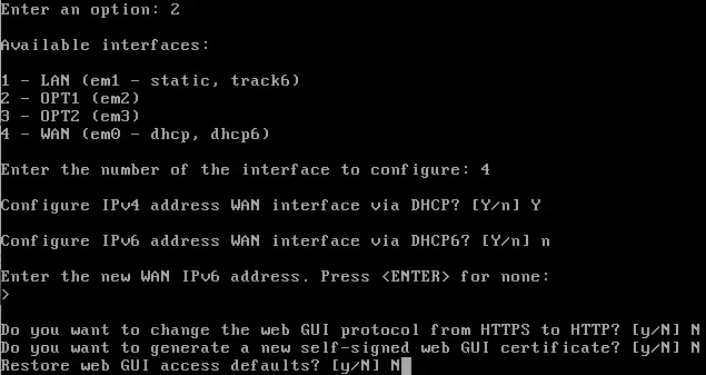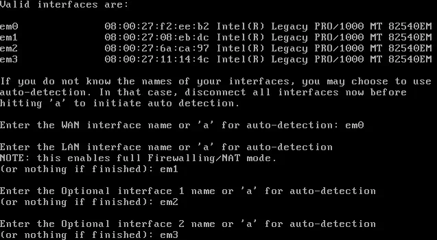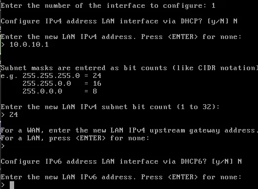 La asignación de interfaces inicial que se realiza es incorrecta, por lo que se reconfigurarán mediante la opción Assign interfaces y Set interface IP address. Se muestra la configuración para la interfaz WAN y la interfaz LAN. La configuración para las otras dos interfaces es similar a la de la red LAN.