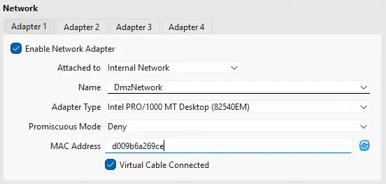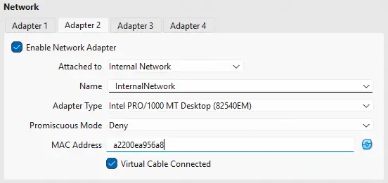 Es necesario recordar que en la configuración de red es necesario especificar las redes internas a las que pertenecerá la máquina virtual y la dirección MAC configurada en OPNsense para que el servidor DHCP sepa que dirección IP asignar a las máquinas. Así configuramos las interfaces de red de la máquina virtual VM1.
