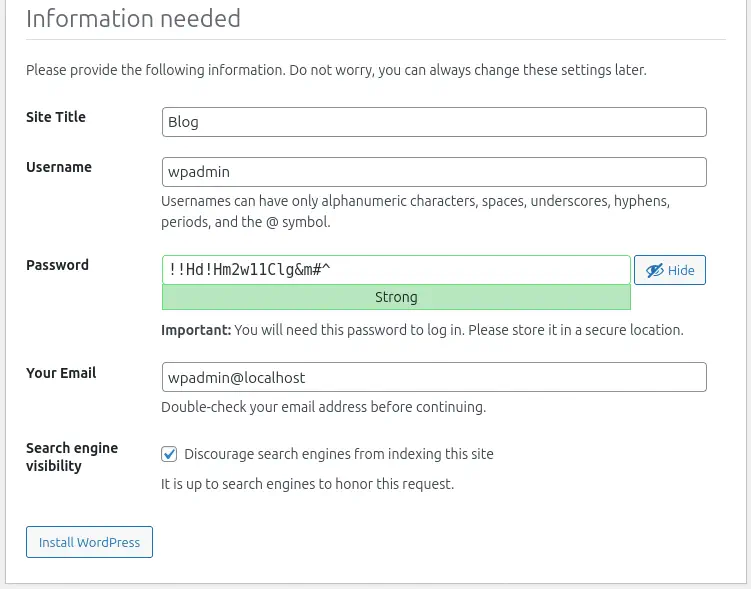 Ahora configuraremos la instancia de WordPress mediante su asistente web. Dispondremos de una contraseña generada aleatoriamente de la que tomaremos nota para iniciar sesión posteriormente.