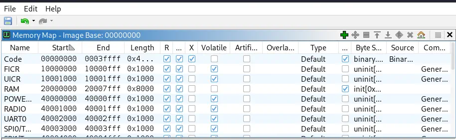 Observamos que la dirección del código es la 0x00000000, la de los registros de fábrica (FICR) es la 0x10000000, la de los registro de usuario (UICR) es la 0x10001000, la de la memoria RAM es la 0x20000000, y la de los periféricos la 0x40000000 y la 0x50000000. Cada SoC tiene unas direcciones de memoria diferentes y si no se especifican correctamente en Ghidra se producirán errores en el desensamblado a la hora de buscar las referencias a las funciones. Por ejemplo el inicio de la memoria flash del STM32 es la dirección hexadecimal 0x0800000.