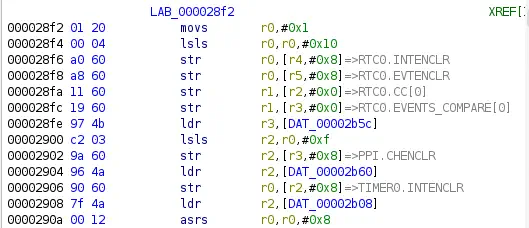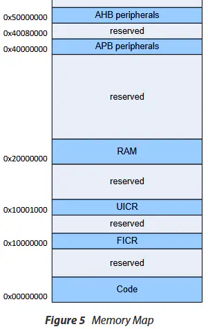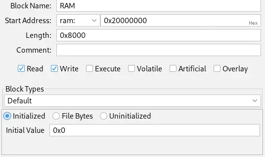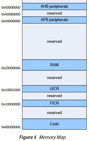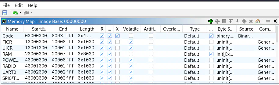 Observamos que la dirección del código es la 0x00000000, la de los registros de fábrica (FICR) es la 0x10000000, la de los registro de usuario (UICR) es la 0x10001000, la de la memoria RAM es la 0x20000000, y la de los periféricos la 0x40000000 y la 0x50000000. Cada SoC tiene unas direcciones de memoria diferentes y si no se especifican correctamente en Ghidra se producirán errores en el desensamblado a la hora de buscar las referencias a las funciones. Por ejemplo el inicio de la memoria flash del STM32 es la dirección hexadecimal 0x0800000.