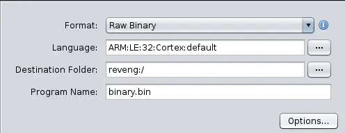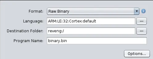 Tras abrir Ghidra creamos un nuevo proyecto File > New Project... de tipo Non-Shared Project, que se guardará en una carpeta ya existente previamente. A continuación cargamos el archivo desde la opción File > Import File... y seleccionamos el archivo binario. Nos aparece un formulario en el que debemos de especificar su formato Format, en este caso Raw Binary, su arquitectura Language, en este caso cortex (ARM Cortex / Thumb little endian).