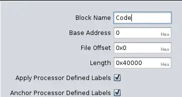 Finalmente en Options... podemos especificar la dirección de inicio en la memoria Base Address en caso de que sea diferente a 0x0. En este caso clasificamos el nombre del bloque Block Name como Code.