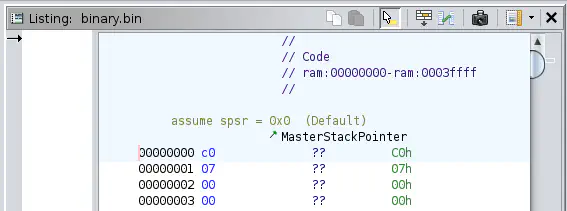Al desensamblar el archivo obtendremos las instrucciones en formato ensamblador ARM. Las instrucciones que hagan referencia a funciones del propio código se encontrarán en el propio rango 0x0-0x40000, pero el sistema embebido utilizará otras direcciones de memoria, por ejemplo, para la memoria RAM o para los periféricos, las cuáles Ghidra desconoce, por lo que tendremos que cargarlas desde un archivo CMSIS-SVD utilizando el plugin GhidraSVD.