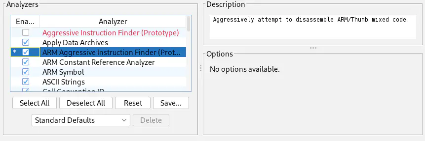Ahora ya podemos analizar el archivo mediante la opción Analysis > Auto Analyze. Se abrirá la ventana Analysis Options en la que en este caso junto a las opciones predeterminadas se activará la opción Aggressively attempt to disassemble ARM/Thumb mixed code..