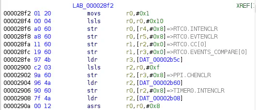 Gracias a la carga del archivo SVD observamos referencias al registro del contador en tiempo real del dispositivo (RTC), RTC0.INTENCLR. Tendremos que consultar la documentación del fabricante para relacionar el nombre del registro con su significado. Por ejemplo para el nRF51 disponemos de su manual de referencia. En el caso de chips más modernos como el nRF52 tenemos más explicaciones detalladas en su web de documentación.
