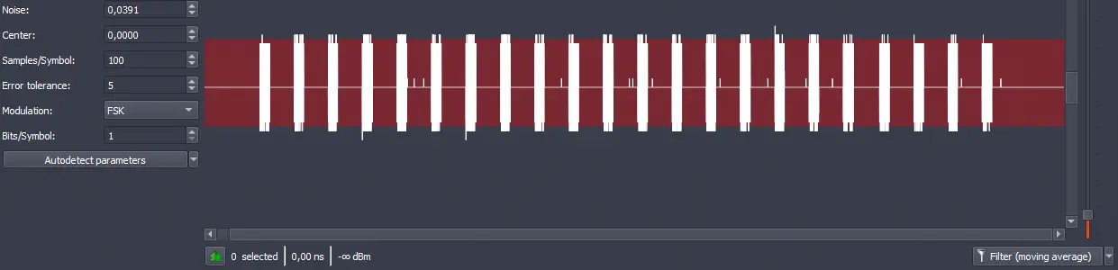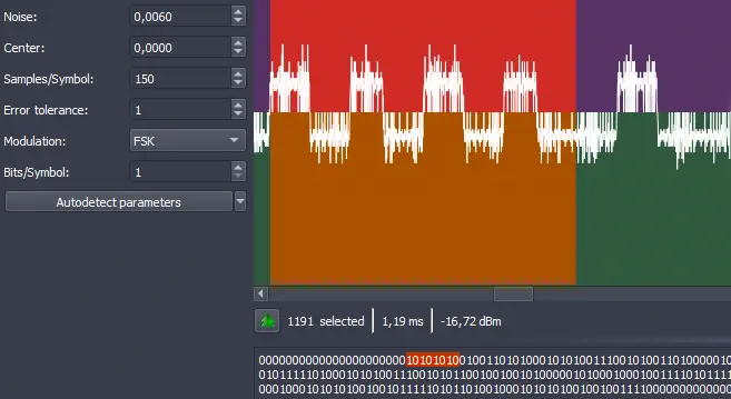 Para analizar e interpretar este tipo de señales, una herramienta muy útil es Universal Radio Hacker (URH). URH permite capturar, visualizar y decodificar transmisiones de radio digital de forma interactiva. A través de su interfaz gráfica, es posible observar cómo se alternan las frecuencias que representan los bits y, con un proceso manual de análisis, deducir la estructura de los mensajes transmitidos. La decodificación manual en URH implica: