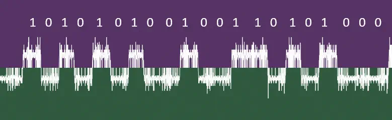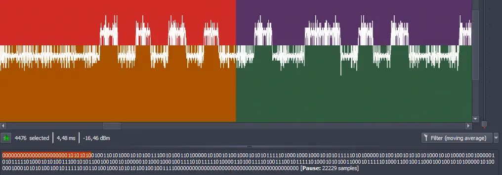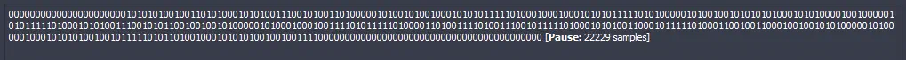 Al inicio de la señal observamos varios valores a 0. A continuación observamos un patrón 10101010. Esto se suele corresponder a un preámbulo, una serie de bits utilizados para sincronizar el receptor con la señal emitida por el transmisor (tal como la hemos utilizado anteriormente para calcular la duración de la señal de bit). Podemos seleccionar estos bits y eliminarlos ya que no contienen ningún dato.