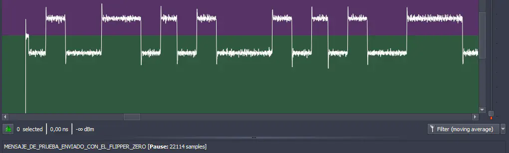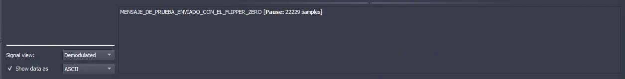 Obtenemos el mensaje MENSAJE_DE_PRUEBA_ENVIADO_CON_EL_FLIPPER_ZERO. Volviendo a capturar la señal con una ganancia más alta observamos una señal más limpia.