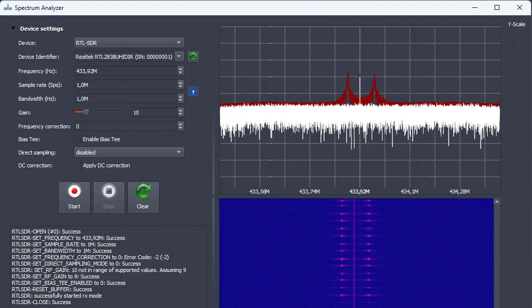 En primer lugar, vamos a buscar en las diferentes frecuencias del espectro radioeléctrico por la señal emitida. Utilizaremos la función Spectrum Analyzer accesible desde el menú File de URH. Realizaremos la configuración con el dispositivo RTL-SDR en la frecuencia 433,920 MHz, con un ancho de banda de 1 MHz. Ajustaremos la ganancia según la potencia de la señal recibida y al ser FSK la señal, desactivaremos la opción Apply DC correction. Capturaremos la señal con el botón Start.