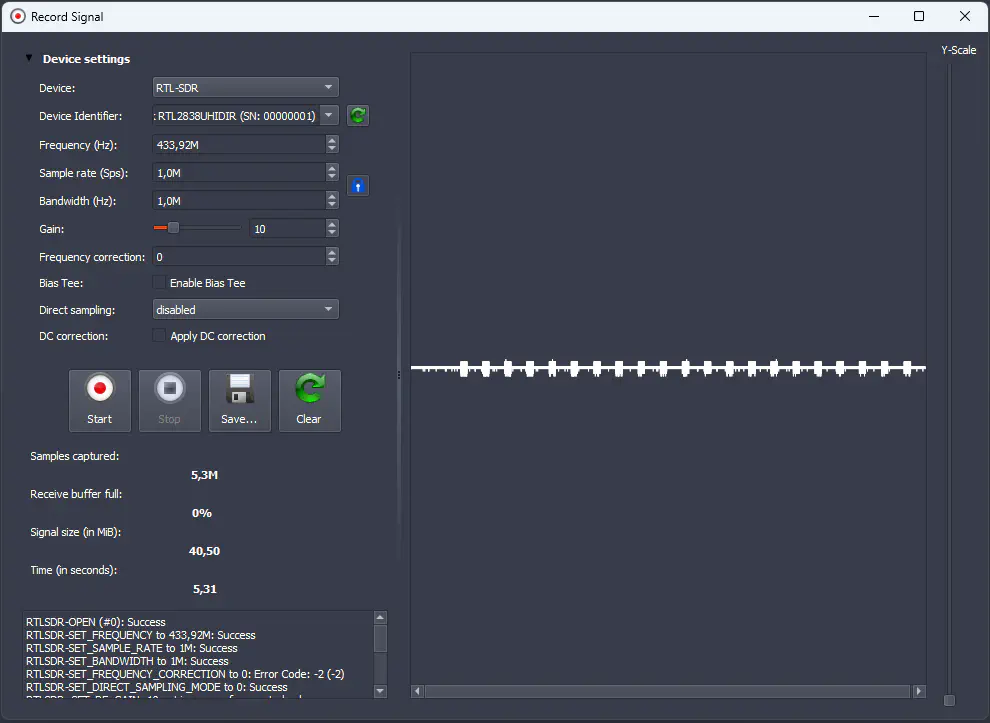 Observamos claramente una señal 2-FSK, con dos frecuencias claramente diferenciadas (433,876 MHz y 433,971 MHz) junto a la portadora (433,920 MHz). Con estos datos calculamos la desviación de f0 y f1 de la señal portadora de alrededor de 48 KHz, coincidiendo con una de las modulaciones incluidas en el Flipper Zero, 2FSK_476. Podemos pasar a grabar la señal y analizarla con la opción Record Signal.