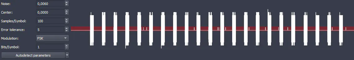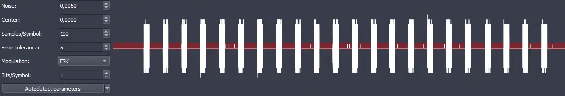 Como modulación Modulation establecemos el valor FSK y en este caso la opción de Bits/Symbol que indica cuantos bits toma cada símbolo y cambia según la modulación se establece en 1, en el caso de la modulación 2-FSK. Ya podemos observar la señal decodificada.