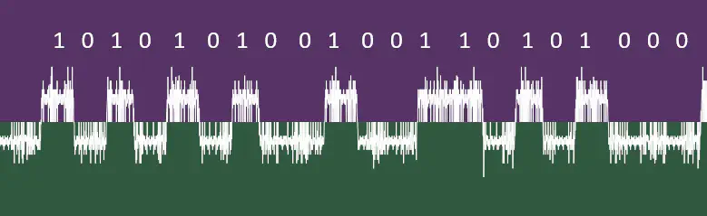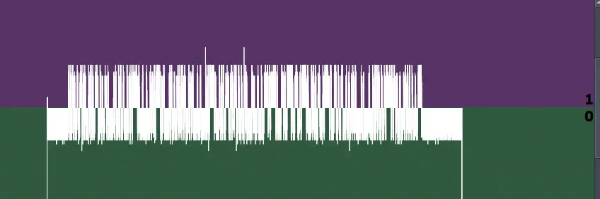 Luego haremos zoom sobre la señal para observarla bit a bit. Observamos una señal en formato de “sierra” aunque se observa claramente que estado es “0” o que estado es “1”. Esto sería una decodificación visual: