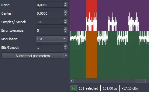 El bit tiene una duración de 151 us, o 151 muestras, ya que la señal capturada tiene un ancho de banda de 1 MHz. Por lo que actualizamos el valor. El siguiente valor de tolerancia a errores Error tolerance dependerá de la calidad de la señal capturada. Si la calidad de la señal es buena sin formato de “sierra” podemos utilizar el valor 0. En este caso con el valor 0 observamos que la señal no se está decodificando, por lo que cambiamos al valor 1 ya que se observa de forma visual que la señal se decodifica correctamente observando el código binario inferior.