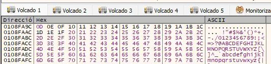 En este momento se habrán enviado a la aplicación todos los caracteres desde 0x01 hasta 0xFF, ya que 0x00 ya se toma como badchar de forma predeterminada. Ahora en el depurador seleccionamos el registro ESP, hacemos clic derecho sobre él y pulsamos en Mostrar en el volcado. Encontramos los caracteres en el volcado por orden. Si encontramos alguno faltante o diferente lo introducimos separados por comas. En este caso no se encuentra ninguno.