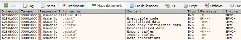 En el depurador vamos a la pestaña Mapa de memoria y buscamos el módulo essfunc.dll. En este caso lo encontramos en la dirección de memoria 62500000.